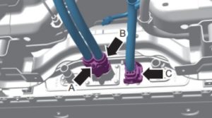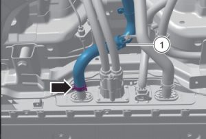 ③斷開電池高壓線束連接插頭(箭頭B)