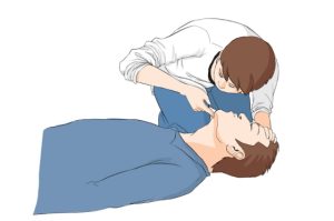 如患者無呼吸,立即進行口對口人工呼吸。摸頸動脈,如果能感覺到搏動,那么僅作人工呼吸即可。為防止細菌感染,采用接口套,用酒精消毒。施救者一手捏住患者鼻子,大口吸氣,屏住,迅速俯身,用嘴包住患者的嘴,快速將氣體吹入。與此同時,施救者的眼睛需觀察患者的胸廓是否因氣體的灌入而擴張,氣吹完后,松開捏著鼻子的手,讓氣體呼出,這樣就是完成了一次呼吸過程。每分鐘平均完成12次人工呼吸。